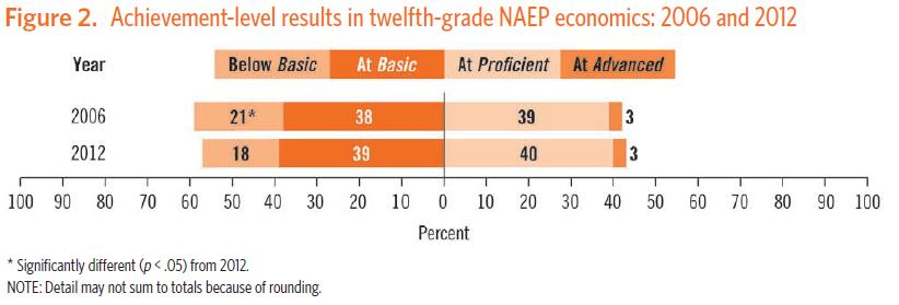 The Nation’s Report Card, released Wednesday, shows that the share of students performing below the Basic level of competency in Economics has declined, yet the increases to higher proficiencies were not significant. Although students in the lowest 10th and 25th percentiles improved their scores from 2006, the overall average test score for all students is essentially unchanged at 152 out of 300.